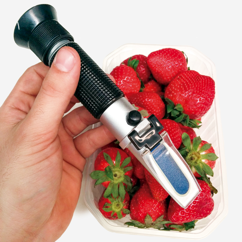 Con el refractómetro podremos medir la cantidad de azúcares presentes en la fruta. El índice de azúcar se denomina grados BRIX. Dependiendo del tipo de fruta en fresco o mermelada necesitaremos un refractómetro que abarque en fresco hasta 32 grados BRIX y hasta 90 en mermeladas.